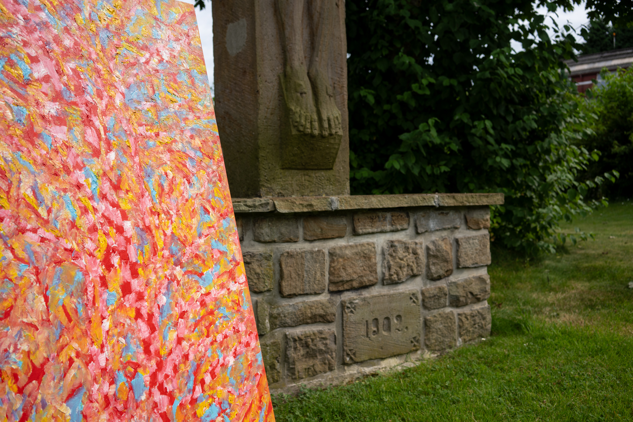 Das gewaltige Industriemuseum ist die perfekte Kulisse für die Ausstellung der Bilderserie Ikarus will nicht brennen. Die Bilder sind wie extra für das Stahlkocher-Monument gemalt. Die historische Gebläsehalle, mit der perfekten Mischung aus Museumsambiente und dunklem, industriellem Charme ist als Kontrast zu den bunten feurigen Farben super geeignet. Im Aussengelände ist mit dem Hochofen im Hintergrund, das Motiv einfach nicht mehr zu überbieten.